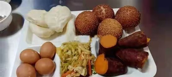 早餐:肉包 卤鸡蛋 奶香馒头 原味豆浆 胡辣汤 蒸山芋 胡萝卜炒豆芽